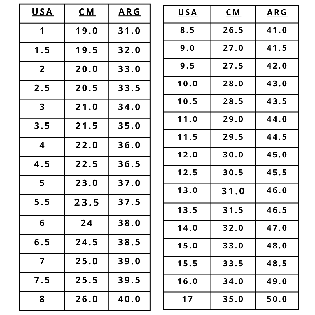 4- Consulta la guía de tallas y busca la talla en CENTIMETROS. Si está entre dos tallas, te recomendamos pedir la más grande.